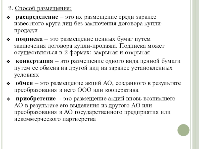2. Способ размещения: распределение – это их размещение среди заранее известного круга лиц без заключения договора купли-продажи
