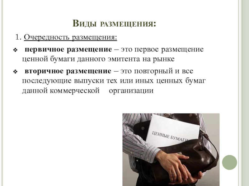 Виды размещения:1. Очередность размещения: первичное размещение – это первое размещение ценной бумаги данного эмитента на рынке вторичное
