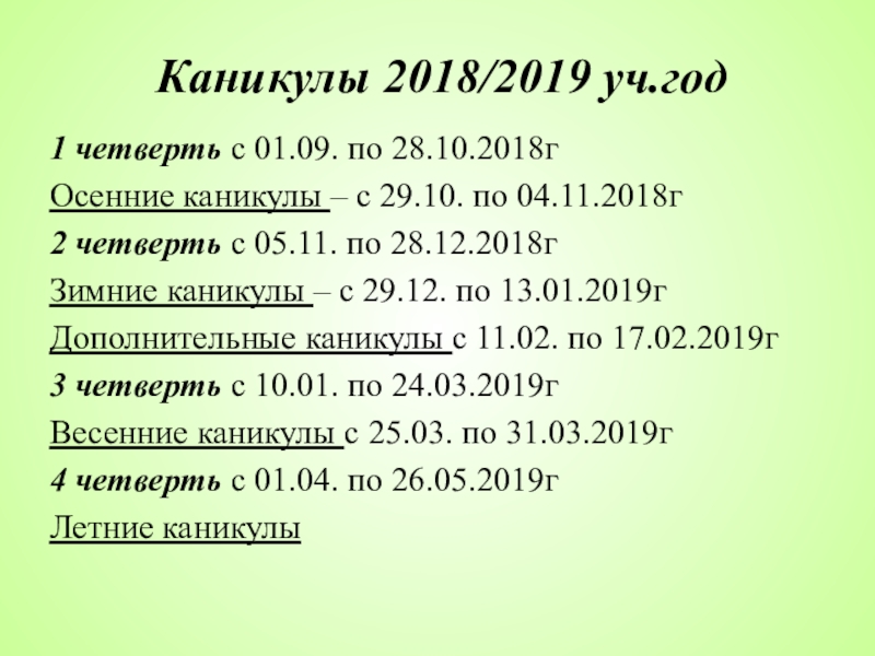 Зимние каникулы – с 29.12. по 13.01.2019г