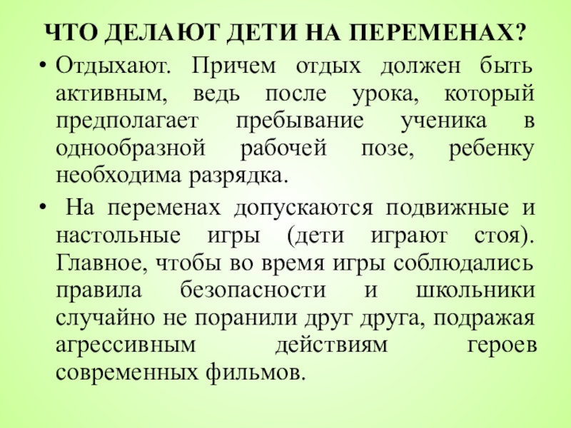 На переменах допускаются подвижные и настольные игры (дети играют стоя). Главное, чтобы во время игры соблюдались правила безопасности и школьники случайно не поранили друг друга, подражая агрессивным действиям героев современных фильмов.