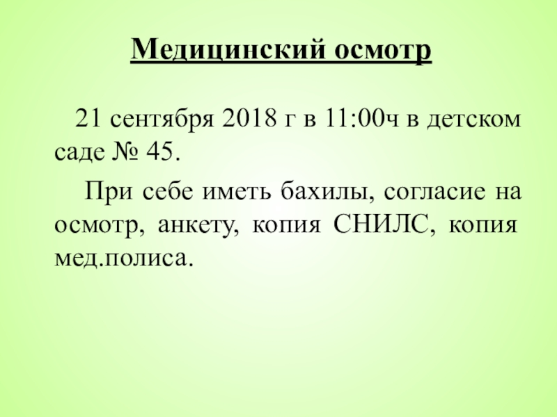 При себе иметь бахилы, согласие на осмотр, анкету, копия СНИЛС, копия мед.полиса.