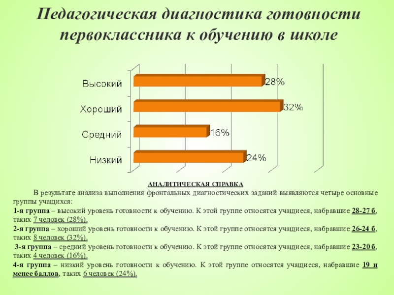 1-я группа – высокий уровень готовности к обучению. К этой группе относятся учащиеся, набравшие 28-27 б, таких 7 человек (28%).
