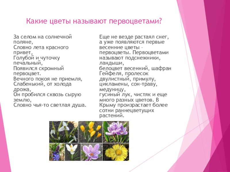 Еще не везде растаял снег, а уже появляются первые весенние цветы – первоцветы. Первоцветами называют подснежники, ландыши,
