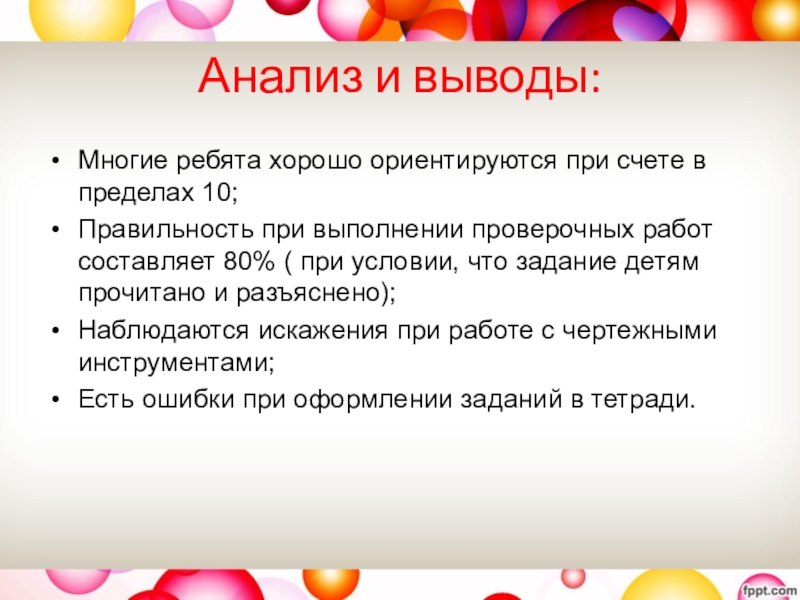 Правильность при выполнении проверочных работ составляет 80% ( при условии, что задание детям прочитано и разъяснено);