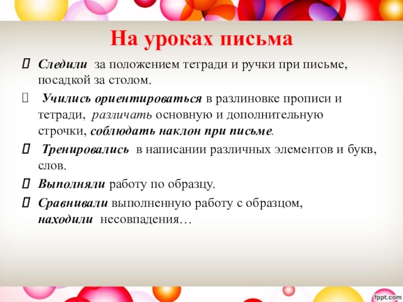 Учились ориентироваться в разлиновке прописи и тетради, различать основную и дополнительную строчки, соблюдать наклон при письме.