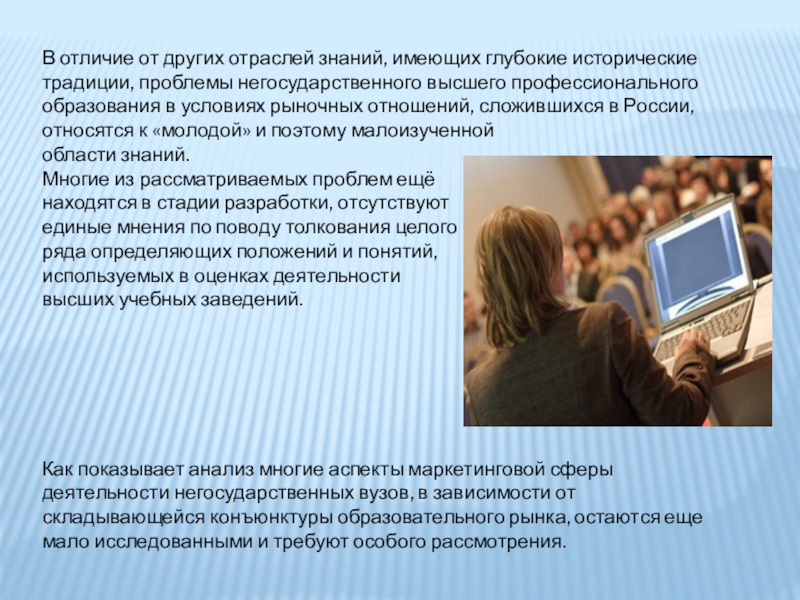 негосударственного высшего профессионального образования в условиях рыночных отношений, сложившихся в России, относятся к «молодой» и поэтому малоизученной