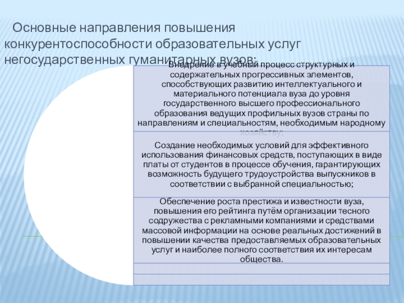 Слайд 23 Основные направления повышения конкурентоспособности образовательных услуг негосударственных гуманитарных вузов: