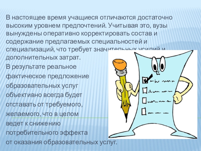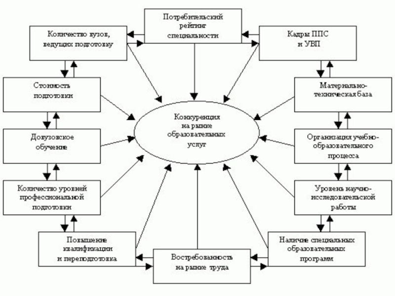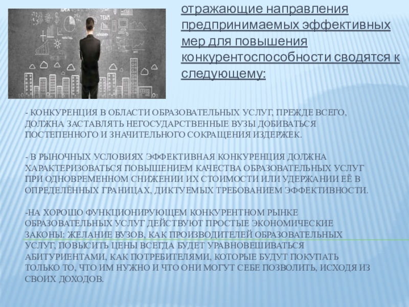 - В рыночных условиях эффективная конкуренция должна характеризоваться повышением качества образовательных услуг при одновременном снижении их стоимости или удержании её в определённых границах, диктуемых требованием эффективности.