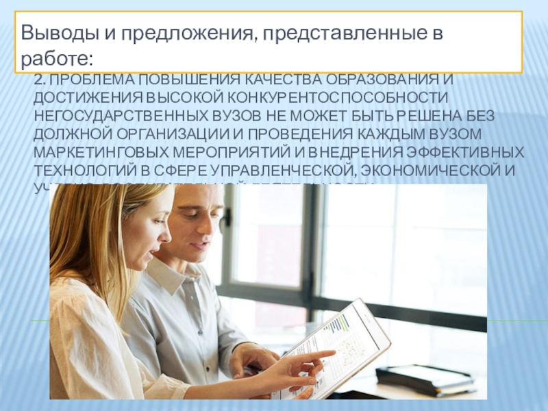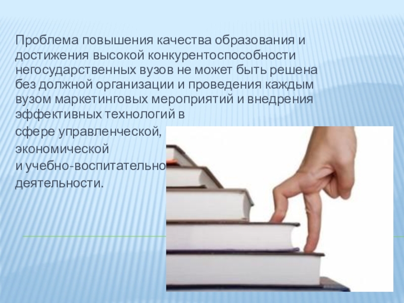 Слайд 20Проблема повышения качества образования и достижения высокой конкурентоспособности негосударственных вузов не