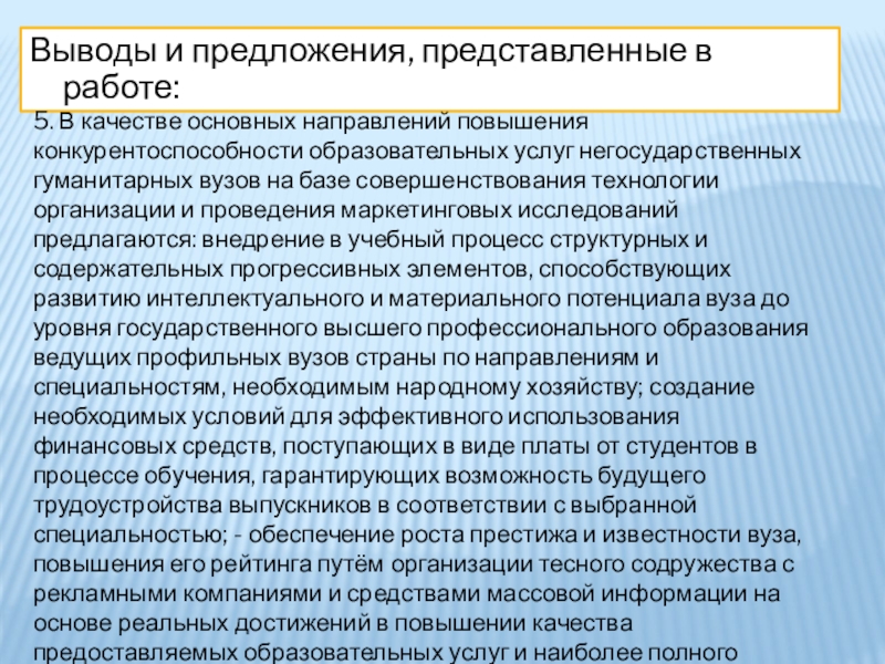 конкурентоспособности образовательных услуг негосударственных гуманитарных вузов на базе совершенствования технологии организации и проведения маркетинговых исследований предлагаются: внедрение в учебный процесс структурных и содержательных прогрессивных элементов, способствующих развитию интеллектуального и материального потенциала вуза до уровня государственного высшего профессионального образования ведущих профильных вузов страны по направлениям и специальностям, необходимым народному хозяйству; создание необходимых условий для эффективного использования финансовых средств, поступающих в виде платы от студентов в процессе обучения, гарантирующих возможность будущего трудоустройства выпускников в соответствии с выбранной специальностью; - обеспечение роста престижа и известности вуза, повышения его рейтинга путём организации тесного содружества с рекламными компаниями и средствами массовой информации на основе реальных достижений в повышении качества предоставляемых образовательных услуг и наиболее полного соответствия их интересам общества.