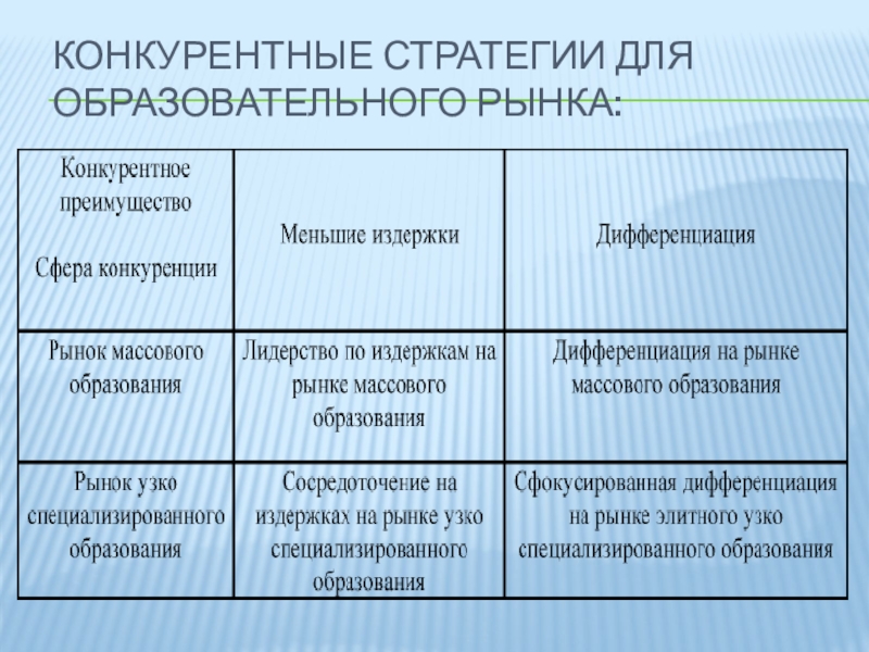 Слайд 7Конкурентные стратегии для образовательного рынка: