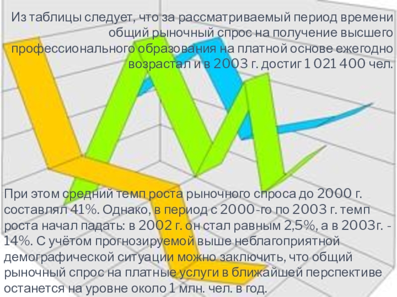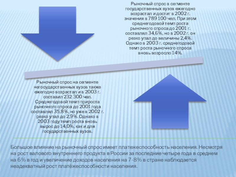 - снижение темпа роста рыночного спроса (с 57,1% в 1998 г до 14% в 2003г), вследствие уменьшения платёжеспособного спроса средних слоев населения - основных «поставщиков» платных студентов;