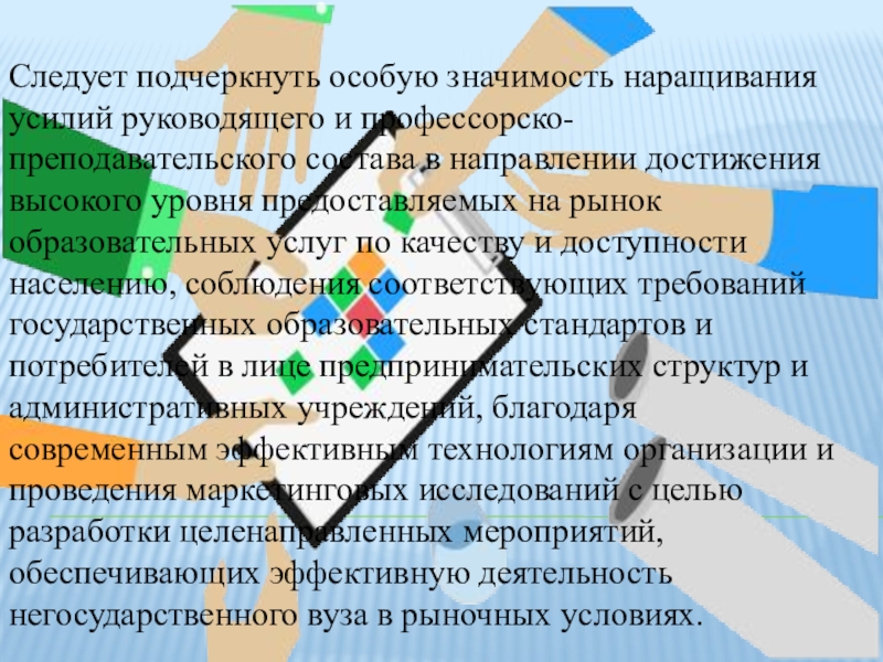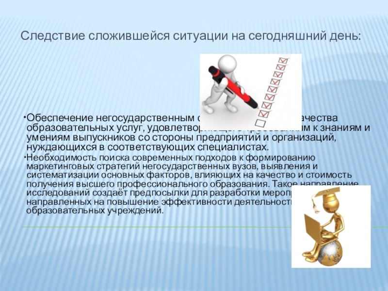 направлении достижения высокого уровня предоставляемых на рынок образовательных услуг по качеству и доступности населению, соблюдения соответствующих требований государственных образовательных стандартов и потребителей в лице предпринимательских структур и административных учреждений, благодаря современным эффективным технологиям организации и проведения маркетинговых исследований с целью разработки целенаправленных мероприятий, обеспечивающих эффективную деятельность негосударственного вуза в рыночных условиях.