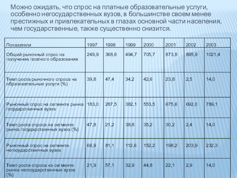 Слайд 9Можно ожидать, что спрос на платные образовательные услуги, особенно негосударственных вузов,