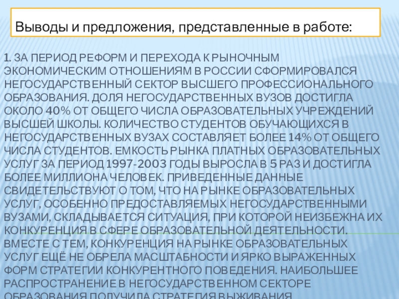 России сформировался негосударственный сектор высшего профессионального образования. Доля негосударственных вузов достигла около 40% от общего числа образовательных учреждений высшей школы. Количество студентов обучающихся в негосударственных вузах составляет более 14% от общего числа студентов. Емкость рынка платных образовательных услуг за период 1997-2003 годы выросла в 5 раз и достигла более миллиона человек. Приведенные данные свидетельствуют о том, что на рынке образовательных услуг, особенно предоставляемых негосударственными вузами, складывается ситуация, при которой неизбежна их конкуренция в сфере образовательной деятельности. Вместе с тем, конкуренция на рынке образовательных услуг ещё не обрела масштабности и ярко выраженных форм стратегии конкурентного поведения. Наибольшее распространение в негосударственном секторе образования получила стратегия выживания.