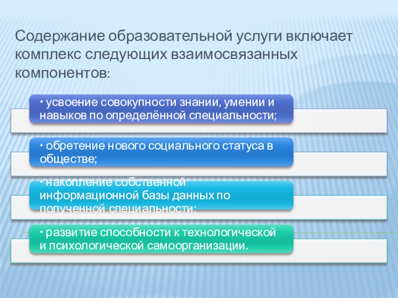 Слайд 13Содержание образовательной услуги включает комплекс следующих взаимосвязанных компонентов: