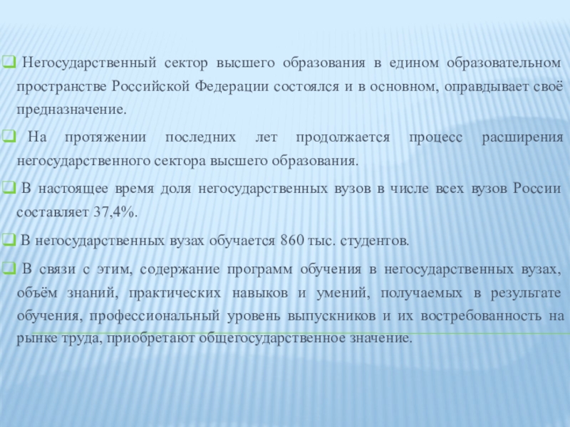 В связи с этим, содержание программ обучения в негосударственных вузах, объём знаний, практических навыков и умений, получаемых в результате обучения, профессиональный уровень выпускников и их востребованность на рынке труда, приобретают общегосударственное значение.