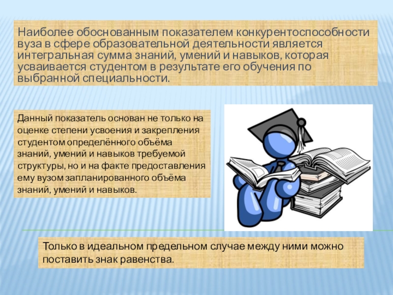 Данный показатель основан не только на оценке степени усвоения и закрепления студентом определённого объёма знаний, умений и навыков требуемой структуры, но и на факте предоставления ему вузом запланированного объёма знаний, умений и навыков.