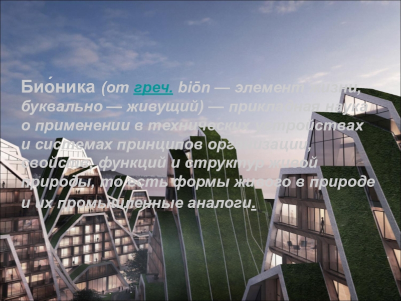 Слайд 3Био́ника (от греч. biōn — элемент жизни, буквально — живущий) — прикладная наука