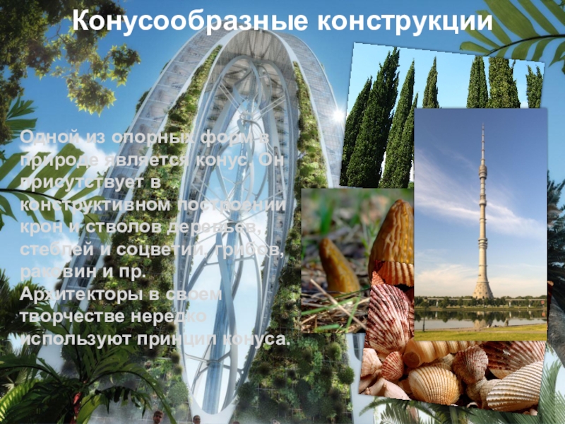 в конструктивном построении крон и стволов деревьев, стеблей и соцветий, грибов, раковин и пр.