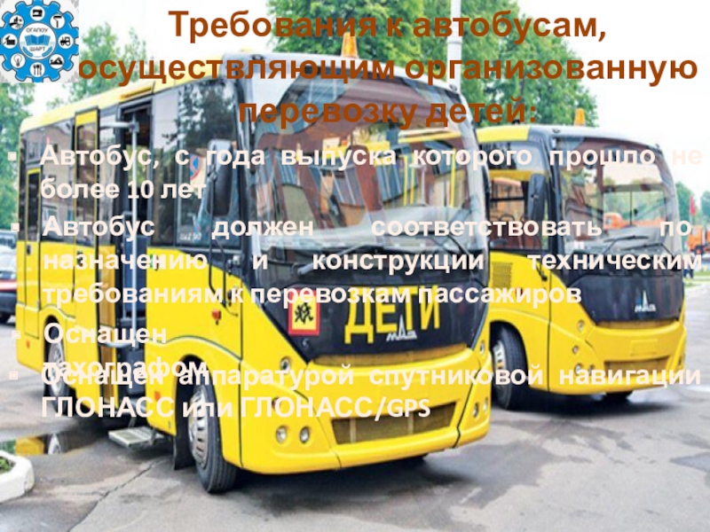 Автобус должен соответствовать по назначению и конструкции техническим требованиям к перевозкам пассажиров