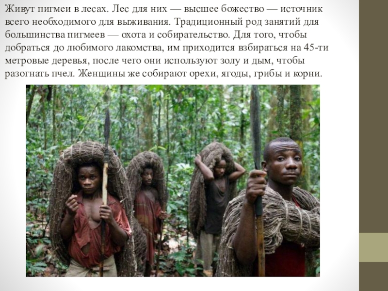 Слайд 3Живут пигмеи в лесах. Лес для них — высшее божество —