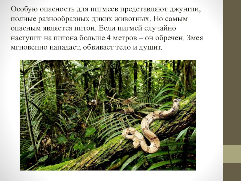 Слайд 12Особую опасность для пигмеев представляют джунгли, полные разнообразных диких животных. Но