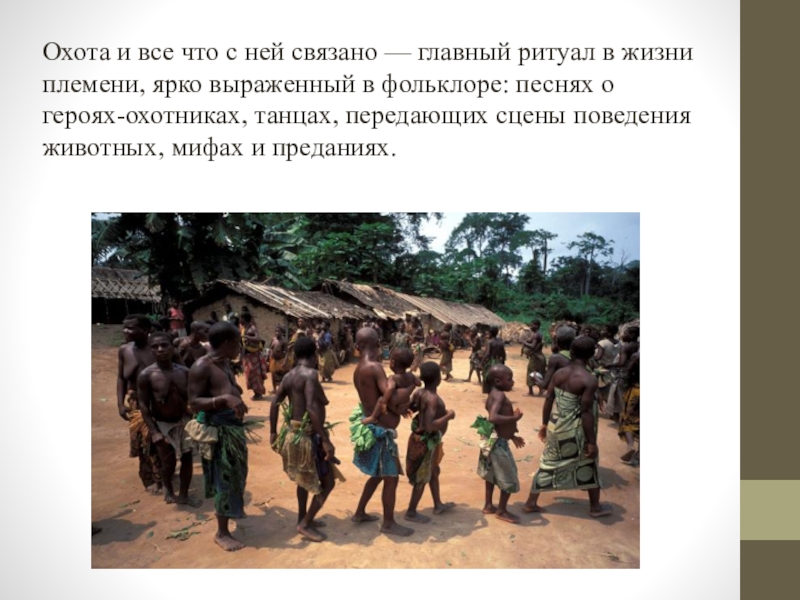 жизни племени, ярко выраженный в фольклоре: песнях о героях-охотниках, танцах, передающих сцены поведения животных, мифах и преданиях.
