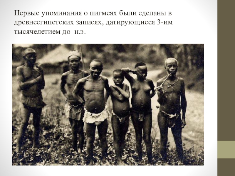 Слайд 2Первые упоминания о пигмеях были сделаны в древнеегипетских записях, датирующиеся 3-им