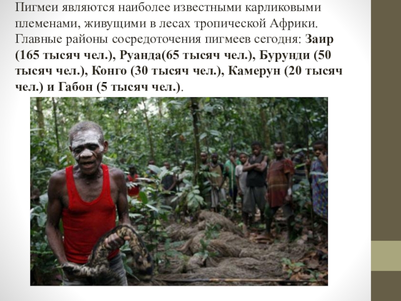 Слайд 5Пигмеи являются наиболее известными карликовыми племенами, живущими в лесах тропической Африки.