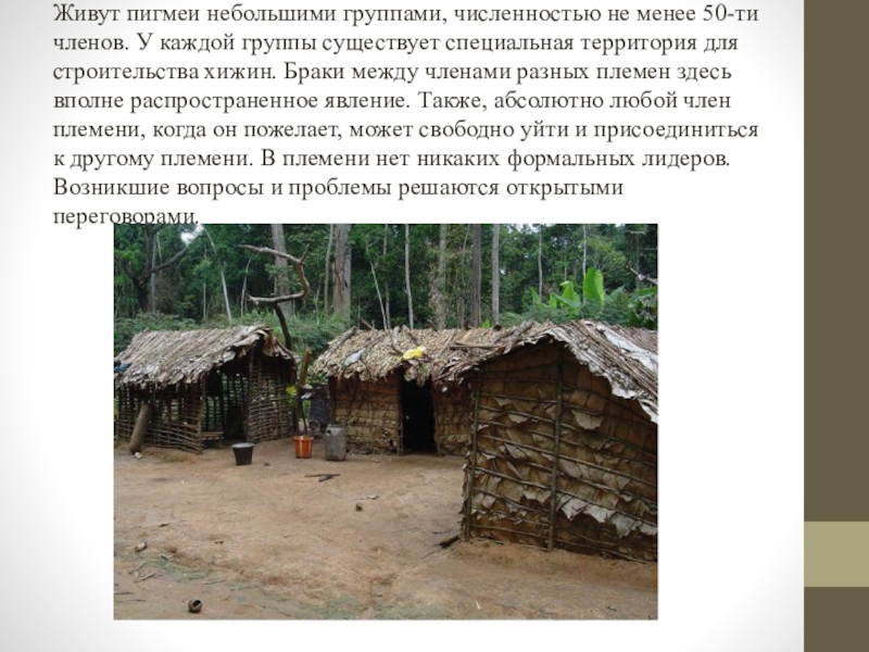 Слайд 4Живут пигмеи небольшими группами, численностью не менее 50-ти членов. У каждой