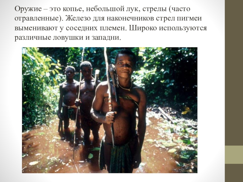 Слайд 7Оружие – это копье, небольшой лук, стрелы (часто отравленные). Железо для