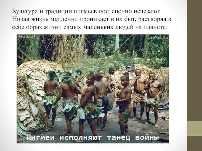 Слайд 15Культура и традиции пигмеев постепенно исчезают. Новая жизнь медленно проникает в