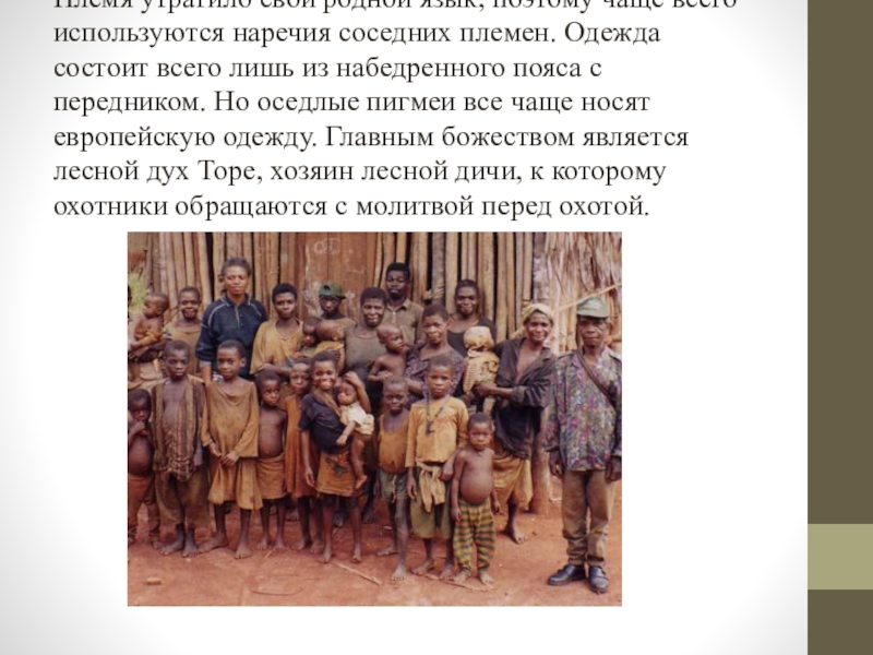 племен. Одежда состоит всего лишь из набедренного пояса с передником. Но оседлые пигмеи все чаще носят европейскую одежду. Главным божеством является лесной дух Торе, хозяин лесной дичи, к которому охотники обращаются с молитвой перед охотой.