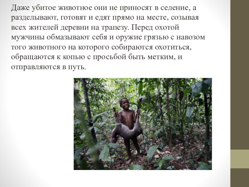 Слайд 9Даже убитое животное они не приносят в селение, а разделывают, готовят