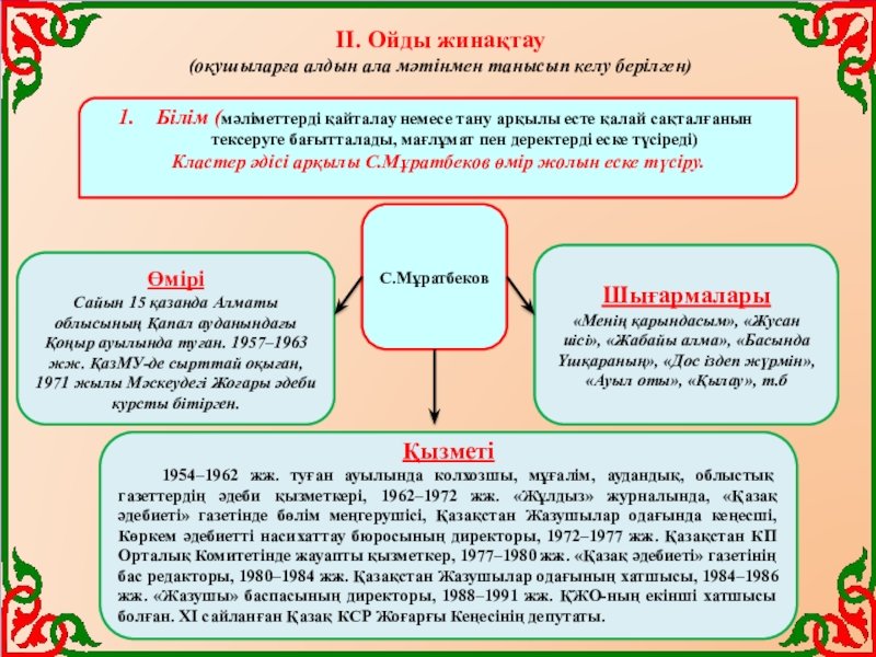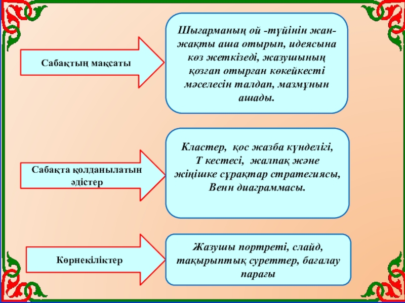 Жазушы портреті, слайд, тақырыптық суреттер, бағалау парағы