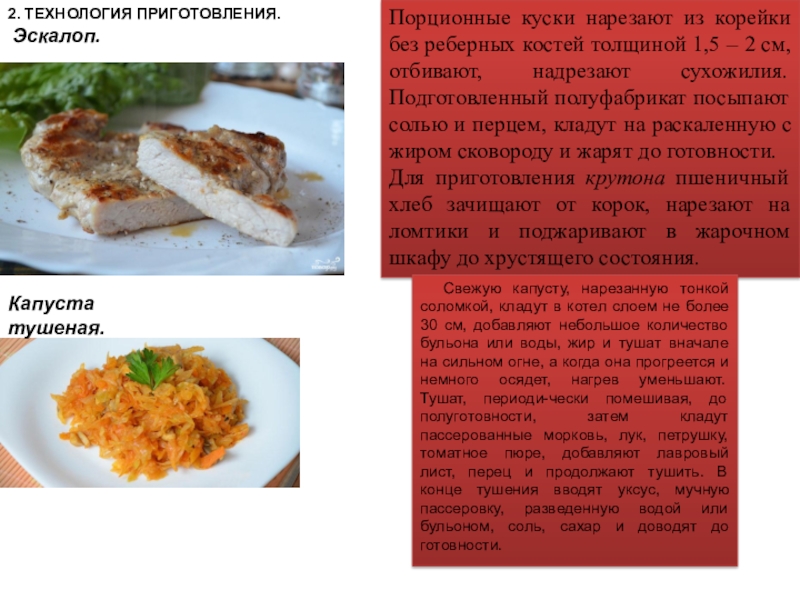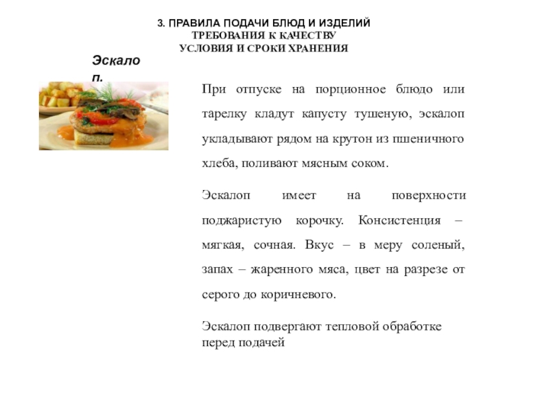 При отпуске на порционное блюдо или тарелку кладут капусту тушеную, эскалоп укладывают рядом на крутон из пшеничного хлеба, поливают мясным соком.
