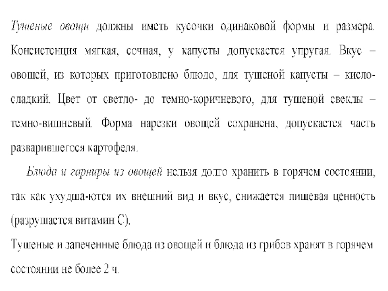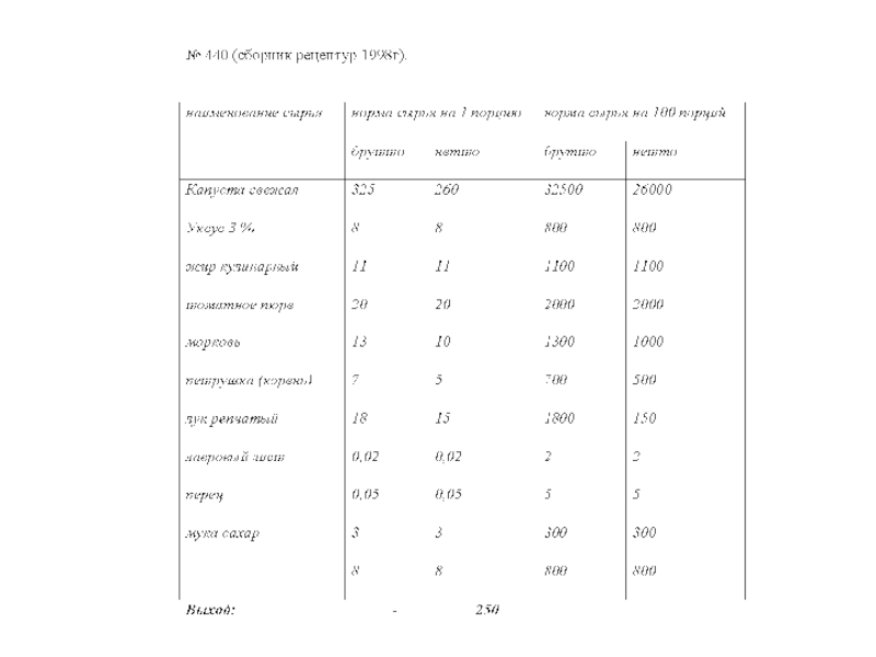 Свежую капусту, нарезанную тонкой соломкой, кладут в котел слоем не более 30 см, добавляют небольшое количество бульона или воды, жир и тушат вначале на сильном огне, а когда она прогреется и немного осядет, нагрев уменьшают. Тушат, периоди-чески помешивая, до полуготовности, затем кладут пассерованные морковь, лук, петрушку, томатное пюре, добавляют лавровый лист, перец и продолжают тушить. В конце тушения вводят уксус, мучную пассеровку, разведенную водой или бульоном, соль, сахар и доводят до готовности.