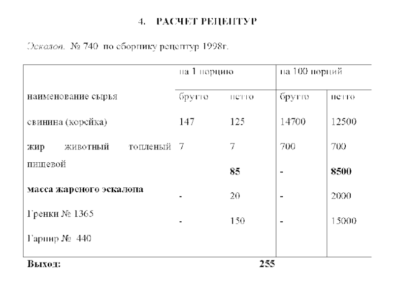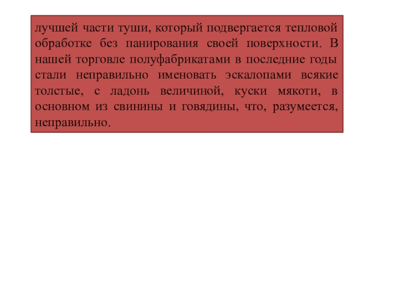 В русско-французской петербургской кухне эскалопами называли обычно ровные, круглые пласты мяса, нарезанные из вырезки (телячьей, свиной) или из других частей мяса (также ровными кружками, поперек волокон).