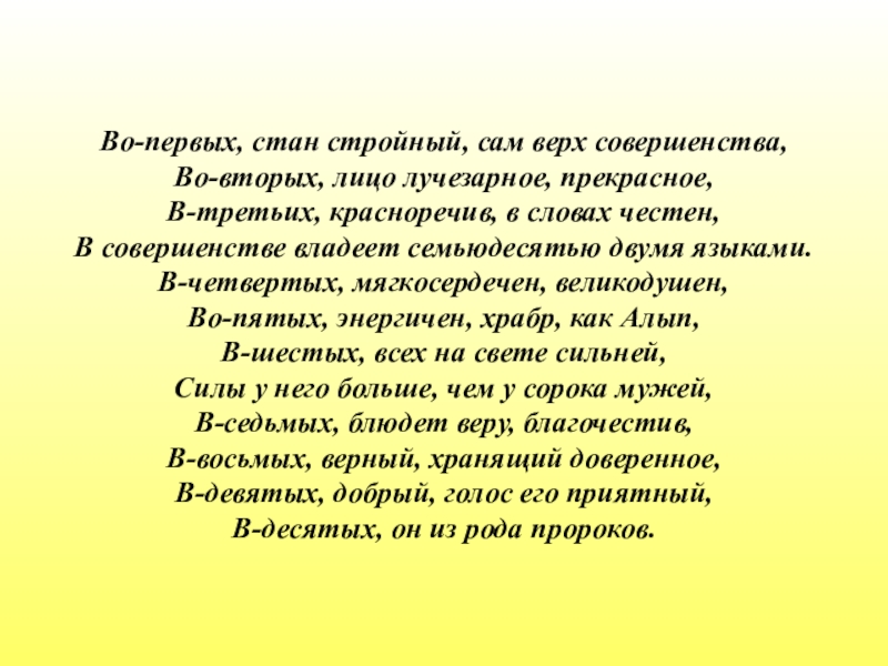 Во-первых, стан стройный, сам верх совершенства, Во-вторых, лицо лучезарное, прекрасное, В-третьих, красноречив, в словах честен, В совершенстве