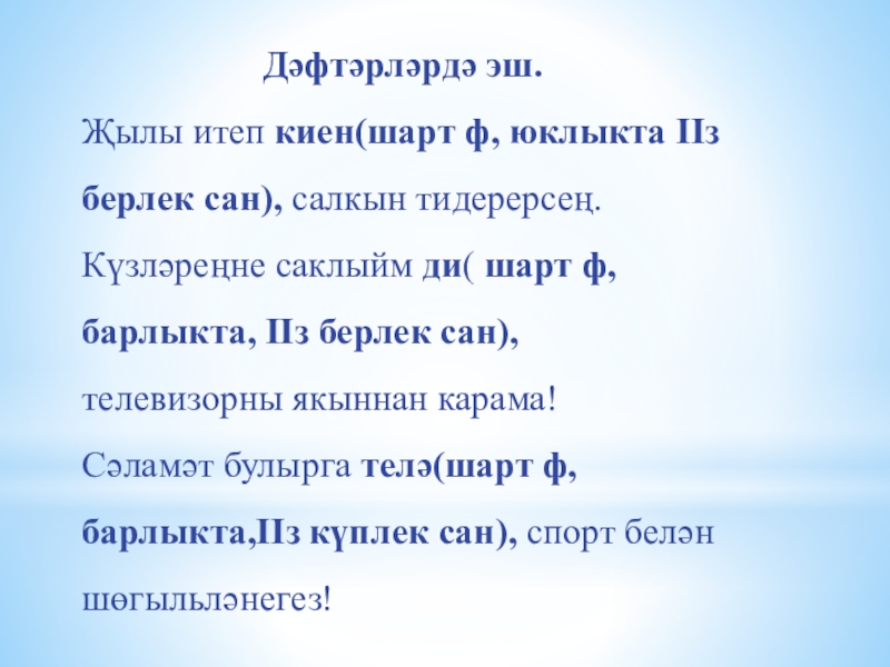 Сәламәт булырга телә(шарт ф, барлыкта,IIз күплек сан), спорт белән шөгыльләнегез!