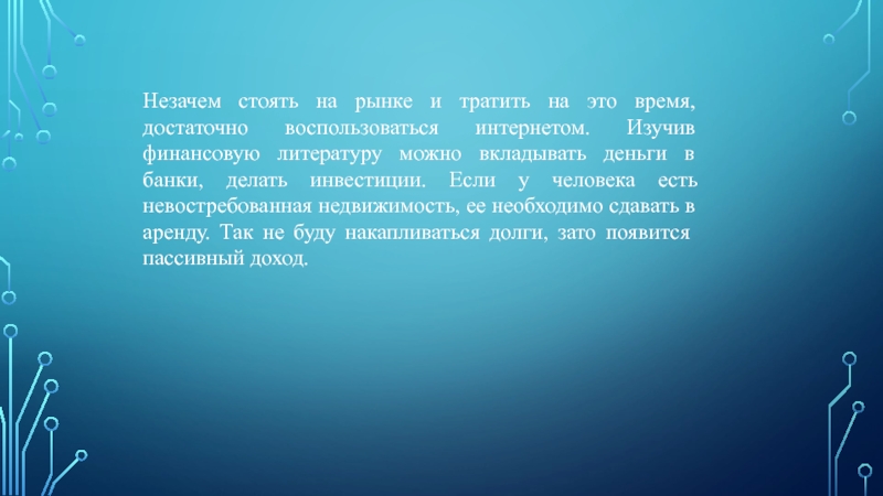 интернетом. Изучив финансовую литературу можно вкладывать деньги в банки, делать инвестиции. Если у человека есть невостребованная недвижимость, ее необходимо сдавать в аренду. Так не буду накапливаться долги, зато появится пассивный доход.