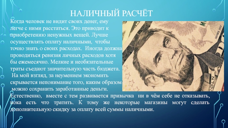 Естественно, вместе с тем развивается привычка ни в чём себе не отказывать, пока есть что тратить. К тому же некоторые магазины могут сделать дополнительную скидку за оплату всей суммы наличными.