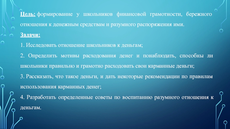 Слайд 2Цель: формирование у школьников финансовой грамотности, бережного отношения к денежным средствам и