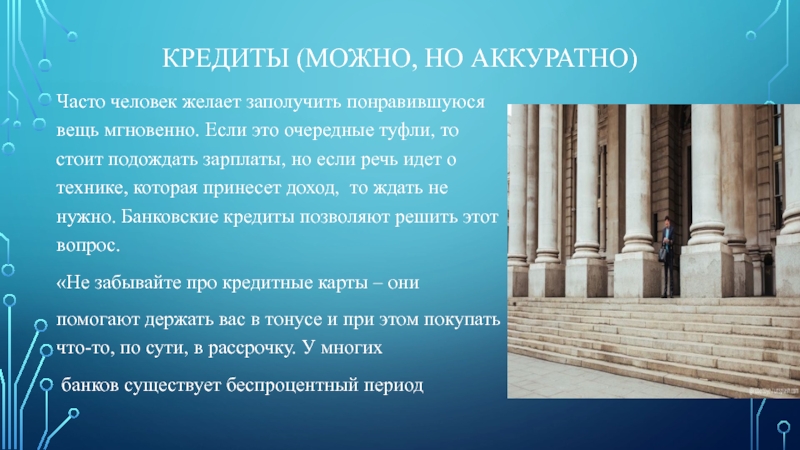 но в разумных пределах. «Плюс кредитки в том, что она позволяет единоразово совершить крупную покупку, стоимость которой вы сможете вернуть в течение 2-3 месяцев (в зависимости от условий вашей программы), переводя по частям деньги с зарплаты».