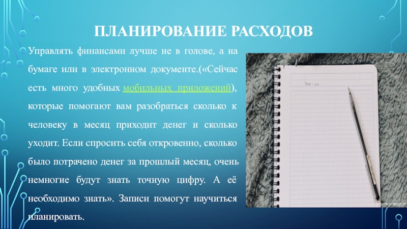 в электронном документе.(«Сейчас есть много удобных мобильных приложений), которые помогают вам разобраться сколько к человеку в месяц приходит денег и сколько уходит. Если спросить себя откровенно, сколько было потрачено денег за прошлый месяц, очень немногие будут знать точную цифру. А её необходимо знать». Записи помогут научиться планировать.