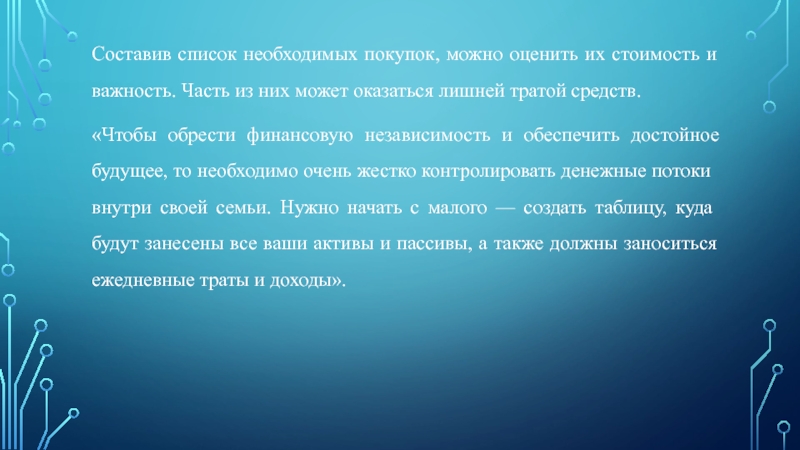 «Чтобы обрести финансовую независимость и обеспечить достойное будущее, то необходимо очень жестко контролировать денежные потоки внутри своей семьи. Нужно начать с малого — создать таблицу, куда будут занесены все ваши активы и пассивы, а также должны заноситься ежедневные траты и доходы».