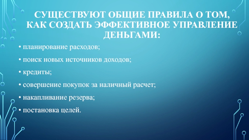 Слайд 6Существуют общие правила о том, как создать эффективное управление деньгами: