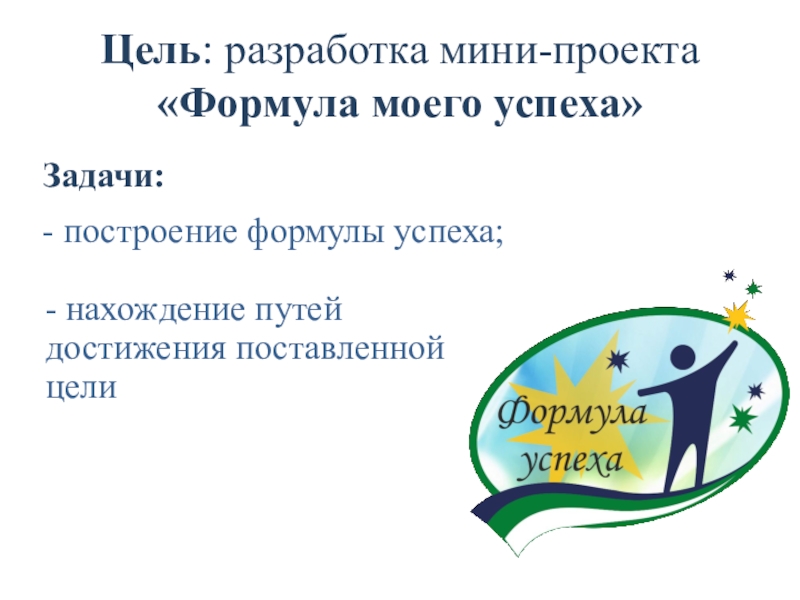 Цель: разработка мини-проекта «Формула моего успеха»- нахождение путей достижения поставленной целиЗадачи:- построение формулы успеха;
