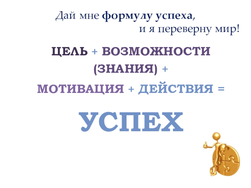 Цель + возможности (Знания) +Мотивация + Действия = УспехДай мне формулу успеха, и я переверну мир!